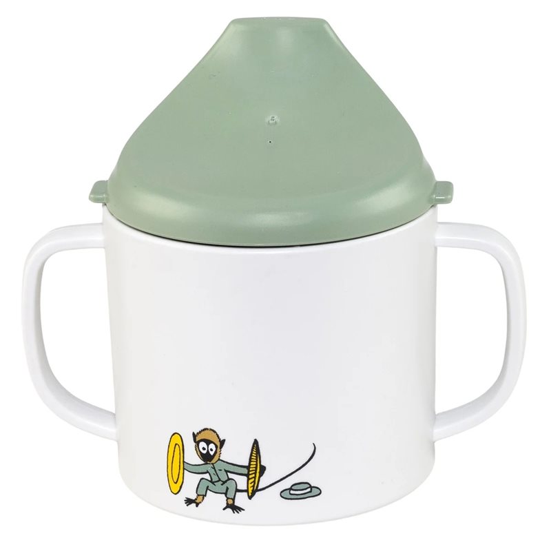 Den här fina muggen har två handtag och lock. I locket sitter en spill ej-ventil av silikon som gör att muggen kan hållas upp och ner utan att läcka. Ventilen kan enkelt tas bort och diskas. När barnet växer och inte längre behöver en spill-fri mugg tas ventilen bort så att barnet successivt kan träna på att hålla muggen rätt. Tids nog kan man tar bort locket helt. Muggen är lika snygg att använda utan lock!