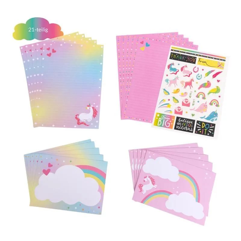 I den praktiska förvaringsmappen med högkvalitativ soft-touch finish hittar du två olika motiv med brevpapper, 5 rosa och 5 med regnbågsfärgad design. TIll dessa finns 10 st matchande kuvert. Dessutom ger 42 klistermärken ännu fler färgglada alternativ och individualitet. En underbar presentidé för alla enhörningsfans!