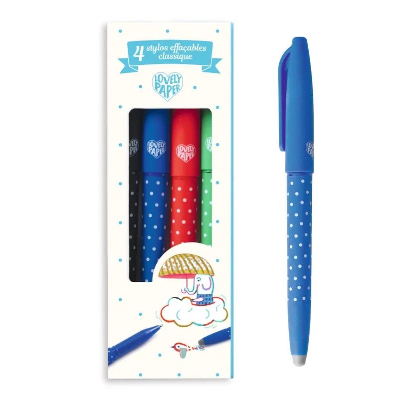 Ett set med raderbara kulspetspennor i 4 klassiska färger: svart, blå, grön och röd. Pennornas korkar har hängklämma så att man kan fästa dem vid exempelvis ett anteckningsblock, och i pennornas ände sitter ett speciellt radergummi som suddar ut bläcket med hjälp av friktion.
