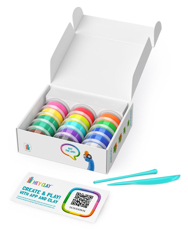 Innehåll: 15 burkar lufttorkande lera (totalt ca 230 g lera i olika färger), 2 skulpteringsverktyg, samt ett informationsblad med bilder på alla figurerna, en länk till där ni kan hämta appen och koden som låser upp appens guider för hur man skapar alla karaktärer i setet.