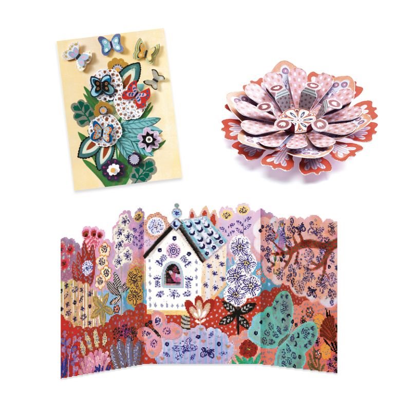 Setet innehåller: Material för att sätta ihop 9 blommor av tunn kartong (ark med utstansade former+häftkuddar); En bild med veck för att kunna ha den stående samt en bläckpenna, 13 stämplar och en stämpeldyna för att dekorera bilden ytterligare; 8 utklippta former att skrapa fram mönster på samt skrapverktyg och snöre att hänga upp dem med; 2 bilder att dekorera samt 2 ark med utstansade blommor och fjärilar, och häftkuddar att fästa dem med; 1 bild med tillhörande upphöjda former med klister på båda sidor och 4 olika glitter-ark menade att fästa på ena sidan av formerna innan de sätts fast på bilden; 1 bild med vita ytor att måla samt en ask med 8 vattenfärger och en pensel att färglägga med.