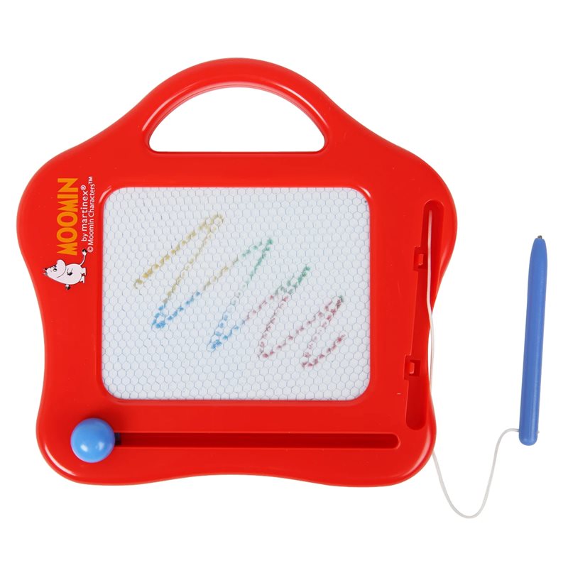 Klassisk magnetisk rittavla med Muminmotiv på ramen, i perfekt storlek för t ex resor. Rita med medföljande "penna" och sudda enkelt genom att dra handtaget fram och tillbaka. Ritytan är vit från början, men har fyra olika färgfält under. När man ritar på dessa ytor är det alltid samma färg som kommer fram (gul, grön, röd, blå).