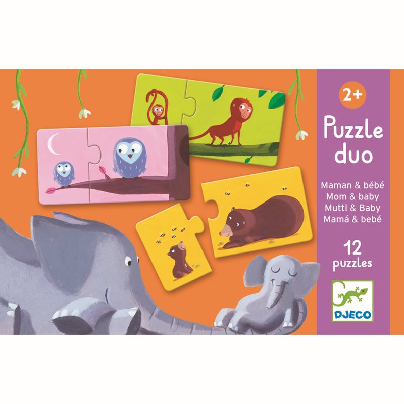 Fint illustrerade små pussel för de minsta. Temat i denna förpackning är mamma och barn, matcha de olika djurmammorna med sina söta ungar, där bakgrundsfärgen ger en ledtråd till vilka bitar som hör ihop. Förpackningen innehåller 12 olika pussel med två bitar var i kraftig kartong och där varje bit bara passar ihop med en annan bit. Förpackat i en färggran och fint dekorerad låda som har ett handtag av snöre som gör det enkelt att bära med sig boxen, även för de minsta.