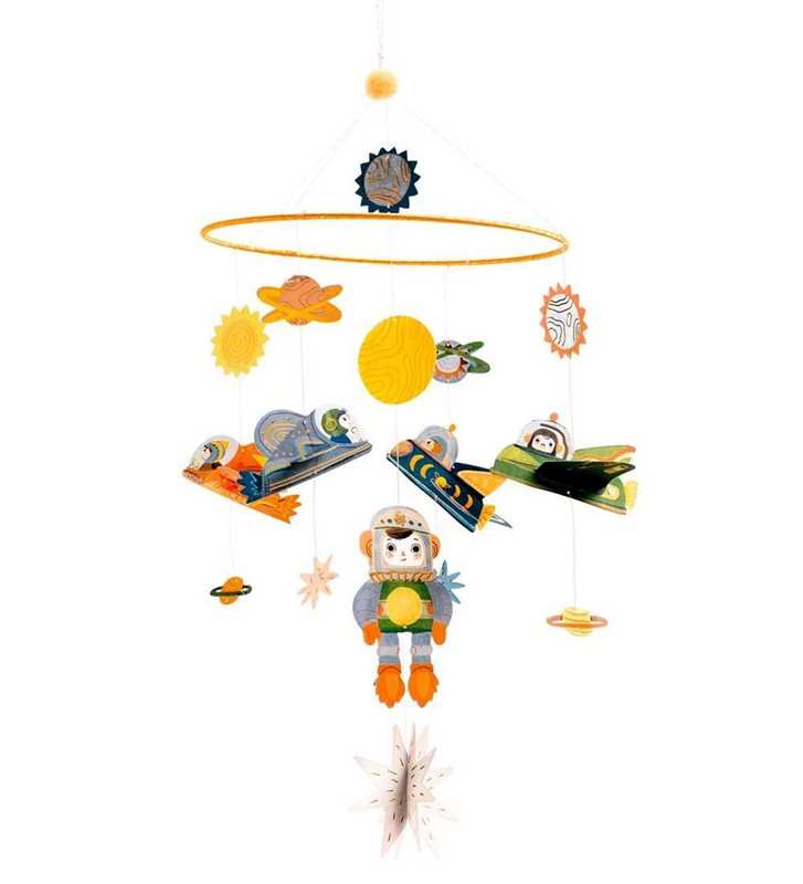 Fin Djeco mobil med vackra, färgglada hängen i rymdtema.